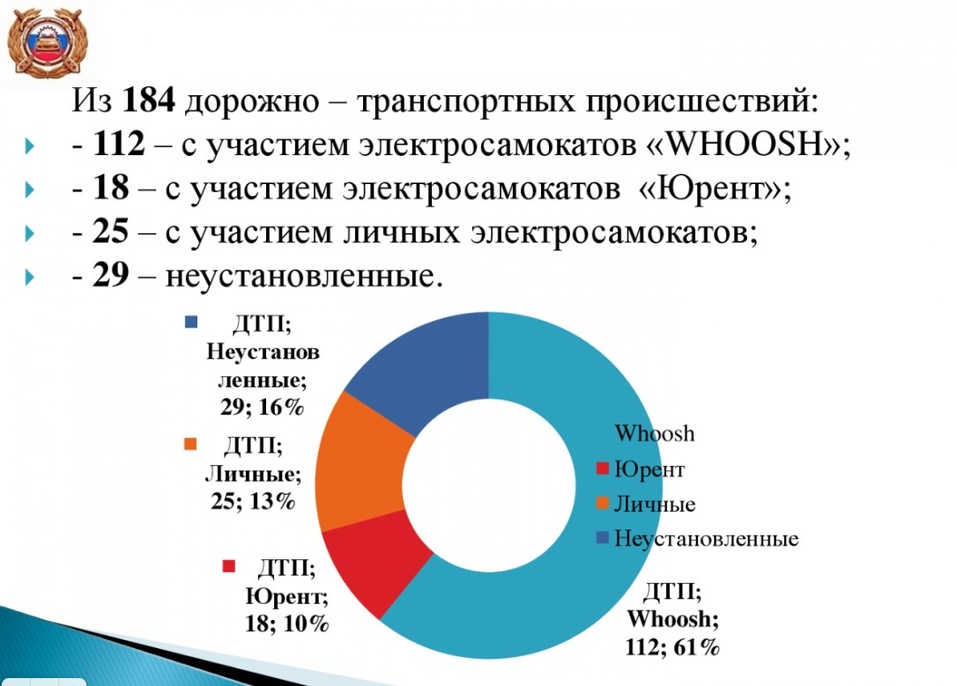 ВРИО начальника ГИБДД Тюмени Александр Таратута рассказал, что за сезон в Тюмени зафиксировано 184 ДТП с участием СИМ (средство индивидуальной мобильности), в результате которых пострадал 191 человек, в том числе 61 несовершеннолетний. Наиболее распространенными видами ДТП были столкновение (64), опрокидывание (61), наезд на пешехода (38) и наезд на препятствие (3).