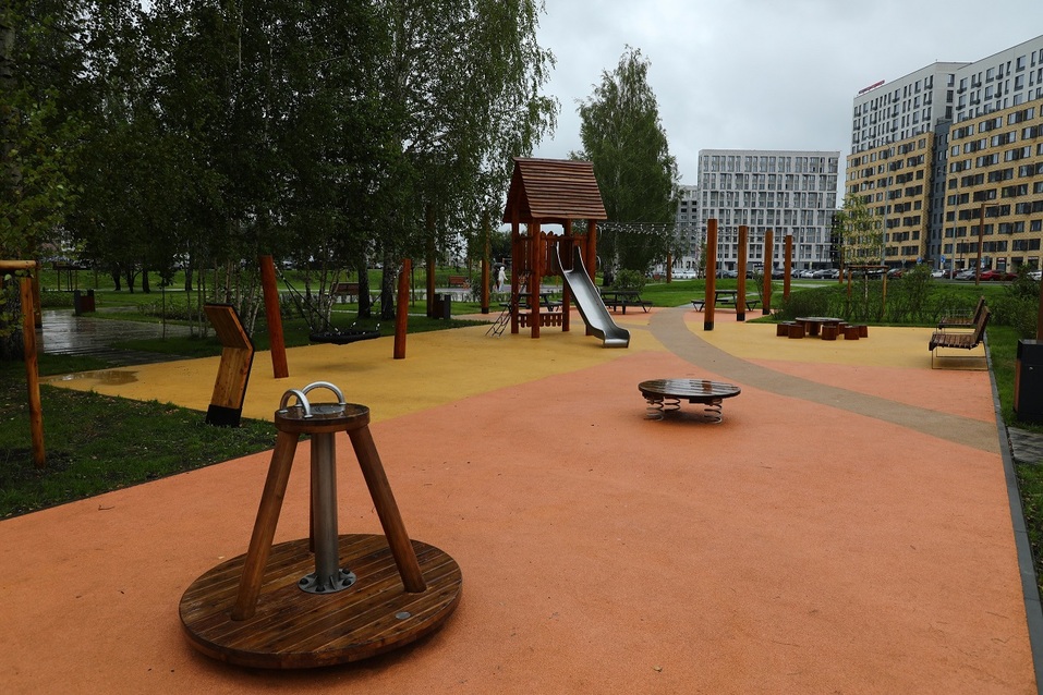 В сквере обустроены спортивные и игровые площадки, подвесные качели, гамаки и шезлонги, велодорожки, а также пространства для занятий йогой.