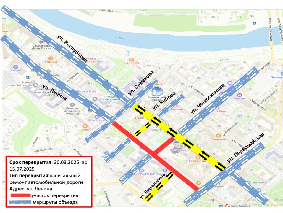 С 30.03.2025 по 15.07.2025 будет прекращено движение на Ленина от Кирова до Первомайской и на Челюскинцев от Ленина до Республики. На время производства работ будет организовано двустороннее движение по Республики (от Первомайской до Семакова), Кирова (от Ленина до Республики).