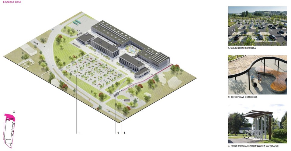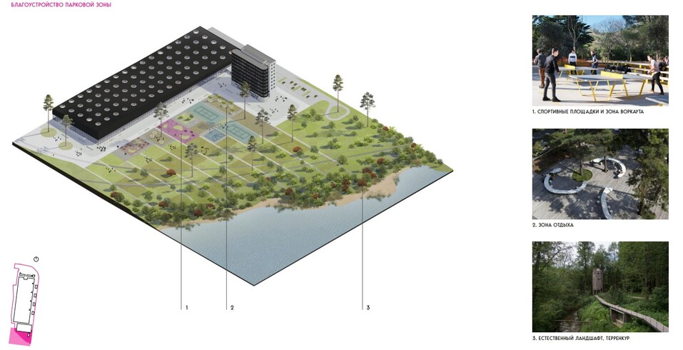 Но в материалах закупки опубликована концепция именно HADAA ARCHITECTS, которая предполагает не только реновацию и строительство комплекса зданий, но и благоустройств прилегающей территории, в том числе береговой линии (как раз там должен появиться природно-туристический маршрут по типу терренкура). Деревья, которых так не хватает тюменцам, предлагается сажать даже внутри парковочного пространства.