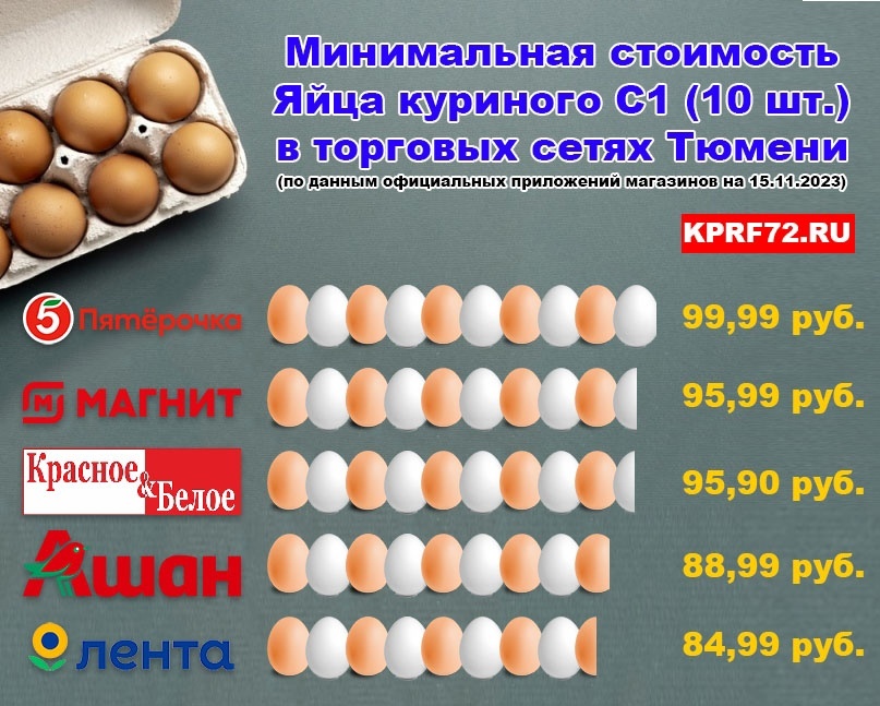 Стоимость десятка яиц первого сорта в Тюменской области подбирается к 100 руб. Представители регионального отделения КПРФ написали обращение в связи с подорожанием яиц не только в ФАС, но и в правительство РФ. Коммунисты предлагают установить в регионе предельные розничные цены на яйца.
